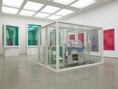Hirst uses the vitrines as both a window and barrier, seducing the viewer visually while also providing a minimalist geometry to frame, contain and objectify his subject. He first constructed a steel and glass tank in the seminal work A Thousand Years (1990), in which a miniature life cycle is created by flies hatching, feeding and then dying at the hands of an insect-O-cutor. In many of his other vitrine sculptures from the 1990s such as The Acquired Inability to Escape (1991) or The Asthmatic Escaped (1992), he implies a human presence through its absence, including relic-like objects such as clothes, cigarettes, ashtrays, tables and chairs.