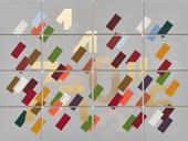 Almond’s paintings similarly invoke the intrinsic logic and communicative potential of numbers. As a primary determinant of human experience, numbers make legible the multidimensional, as Almond affirms: ‘Our cosmic landscape and biological make-up all reside in this language for it informs all extremities, from describing spacetime to underlying genetic code and engineering’. Featuring fragmented integers over a modernist grid, the artist’s paintings are variously executed with concrete-based mineral paint; acrylic gel on mirror; or layers of metal leaf including gold, copper, silver and palladium, to actively respond to both diurnal and artificial light. Visualising numbers as symbols of spiritual invocation, such as the recurrence of zeroes emblematising infinitude, Almond hints at the possibility for numbers to recognise that which resists language and to scale that which surpasses human perspective. The use of numbers attempts to overcome, as Almond describes, the ‘failures in our lexicon to cope with the true scale of things beyond human reach’.