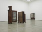 Salcedo’s La Casa Viuda (1992–95) loosely translates to ‘the widowed house’, and deals with the subject of forced displacement of Colombian women seeking safety. In it, doorframes and other fragments of furniture are forcibly conjoined in inter-locking configurations, and may be variously embellished with used clothing or a child’s toy. Approaching figuration in a non-classical sense, Salcedo makes tangible the absent body by invocations of human presence as part of a unique poetic strategy. She frequently returns to furniture or other household items as part of her repertoire of materials, as the artist states: ‘Sculpture is its materiality. I work with materials that are already charged with significance, with a meaning they have acquired in the practice of everyday life.’ Her 20-year long series ‘Untitled’ addressing the genocide of a political party in the context of the Colombian civil war, notably, involves sculptures made up of merged wooden wardrobes, dressers, beds and chairs whose negative spaces have been filled with poured cement. Transformed into unsettling, dislocated assemblages, the ‘Untitled’ works speak of trauma, entombment and the grave interruptions war imposes on ordinary domestic affairs.