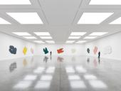 Knoebel’s art is resolutely abstract, and takes Kazimir Malevich’s aesthetic notion of ‘pure perception’ as its point of departure. As the artist states, ‘When I am asked about what I think when I look at a painting, I can only answer that I don’t think at all; I look at it and can only take in the beauty, and I don’t want to see it in relation to anything else. Only what I see, simply because it has its own validity.’ Knoebel’s minimal compositions rely on a strict, pared down vocabulary of forms combined with a subtle but commanding use of colour, all of which serves to expose the physical possibilities inherent in the most basic of materials, such as plywood, aluminium and fibreboard. This is best exemplified by the major installation Raum 19 (1968), conceived while Knoebel was still a student under Joseph Beuys, and now part of Dia Beacon’s permanent collection. Borrowing its title from the number of his studio at the Kunstakademie, Raum 19 consists of 184 wood and fibreboard forms such as frames or stretchers, cylinders, cubes and rectangles – a mutable ensemble which can be reconfigured in any number of ways in accordance with the artist’s impulses. While Raum 19 is an expressive constellation that appears to autobiographically refer to an art student’s raw material, the installation is itself an instance of reduction, a formal exercise of peeling back the work of art to its most basic component parts.