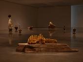 This process of enquiry draws on meticulous research, and past projects have enlisted the collaboration of experts including scientists, historians, anthropologists, palaeontologists, zoologists, explorers, linguists and engineers. More recently Humeau’s attention has turned to sources of knowledge that may have been considered marginal: to foragers, keepers of oral history and local mythologies, in order to construct a more inclusive concept of knowledge. Thinking about each installation as an ecosystem in which the artworks are active agents, Humeau orchestrates physical encounters, offering the viewer an experience that is both sublime and unsettling; a combination she describes as ‘being exhilarated and frightened [by] at the same time.’