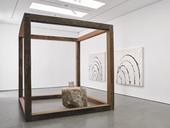 Gates trained as both a sculptor and an urban planner, and his practice contends with the notion of Black space as a formal exercise, defined by collective desire, artistic agency, and the tactics of a pragmatist. Gates’s ‘Civil Tapestry’ series, tar paintings and roofing works, all engage with found or discarded material from his neighbourhood in Chicago. He specifically seeks out materials that have a historic and iconic significance in order to repurpose them through his own artistic lens and within the context of modernist art historical tropes.